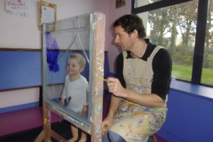 Depuis mercredi, Hugo DURAS, coloriste imaginaire, intervient à la crèche.Il propose une performance artistique « Comme un pinceau dans l’eau »Au cours de celle-ci, il invite les enfants à participer et à devenir acteurs à leur tour.