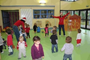 Puis, nous avons fait le temps d’accueil tous ensemble! Chants de noël et histoires de noël étaient au programme! Ensuite, ils ont pu danser, puis écouter des histoires de noël… Et est arrivée l’heure du spectacle tant attendu! Les enfants ont pu découvrir un spectacle où se mêlaient chants, musiques, théâtre en ombres chinoises… avec Christine et… Mr Pouce!! Mais il y avait aussi Filou le loup, Rikiki la petite souris, Lulu la tortue et le père-noël! Par contre, une journée comme ça, ça creuse! Alors les enfants sont allés, chacun leur tour, se servir au buffet préparé par Sandrine. Il y avait des mini-cakes aux lardons et pruneaux, des galettes au fromage et jambon, des clubs-sandwichs au jambon et au thon, des brochettes de tomates et fromage, et pour le dessert des verrines composées de petits beurre émiettés, mousse de fromage blanc à la framboise, coulis de mangue et ganache au chocolat! Miam! On s’est régalé! Après une bonne sieste, nous nous sommes tous retrouvés dans la salle des repas pour le goûter. Sandrine nous avait préparé de jolies bûches! Pendant le goûter, un gros monsieur habillé en rouge et blanc se promenait dans le jardin. Mais… !? C’est le père-noël!! Certains ont sauté de joie, d’autres ont été un peu plus intimidés… Chacun y est allé à son rythme. Il avait apporté des chocolats en plus! Il nous a dit qu’il avait apporté des cadeaux pour la crèche et qu’il les avait déposés sous le sapin dans l’espace corail. Alors, vite!! On s’est dépêché d’aller voir!! Et là surprise!! Plusieurs cadeaux nous attendaient! Les paquets ont été vite déballés! Le père-noël nous a offert plusieurs jeux en bois, une grosse voiture rouge et jaune, et plusieurs petits camions (ambulance, pompiers, train, et police). Ils ont été vite testé! Merci père-noël pour tous ces jolis cadeaux! Toute l’équipe du P’tit club vous souhaite de joyeuses fêtes de fin d’année!