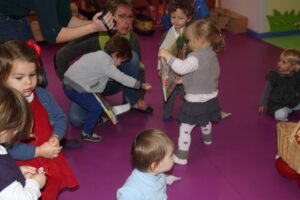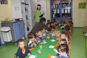Le P’tit Club s’est mis aux couleurs de noël tout le mois de décembre et plus spécialement le vendredi 12 décembre! Un jour particulier car le père noël nous a rendu visite!Il n’a pas fait le même effet à tous les enfants mais on était tous très content de recevoir les cadeaux et de bons chocolats. Il nous a offert un kamishibaï (théâtre d’images) et un joli trône pour fêter les anniversaires! La journée a été ponctué de chants, de danses, d’un magnifique buffet réalisé par Sandrine et du spectacle de Félix et Croquette! Merci à tous les parents qui sont venus conclure cette belle journée devant le film de la journée!