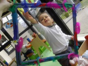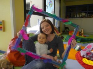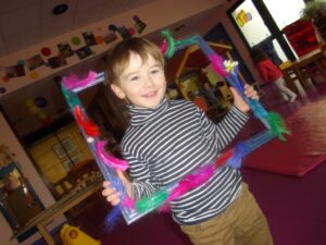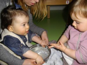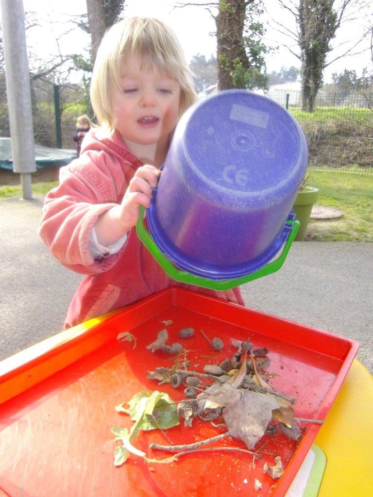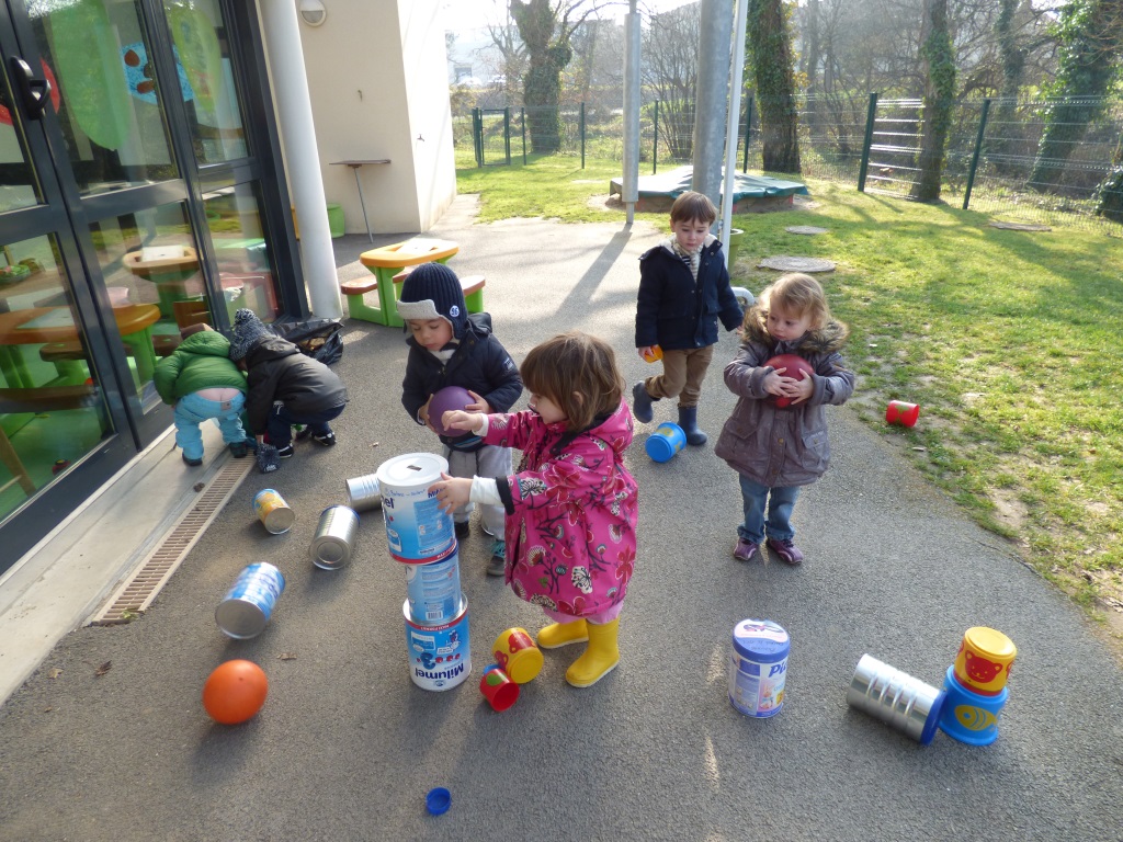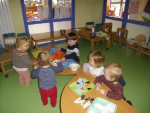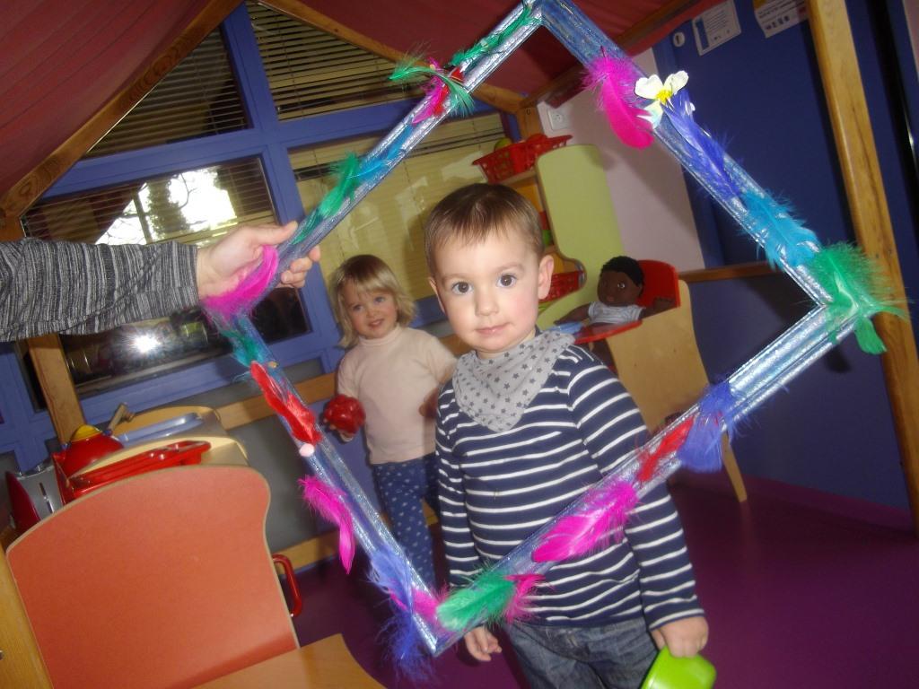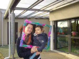 Le but de la Grande semaine de la Petite Enfance est d’organiser « les rencontres du trio » (Parents, enfants et professionnels) autour d’ateliers-jeux dans le milieu d’accueil de l’enfant.Le thème de cette année : autour de l’enfant créateur.Apprendre de l’imagination et de l’incroyable créativité de nos tout-petits !Pour vous plonger avec délice dans la créativité, des ateliers ont été mis en place chaque matin.Vous, parents, pouviez venir partager une matinée avec vos enfants. Merci de votre venue et de votre participation pour le matériel.Alors ? Prêts à vivre une semaine pleine de patouillage, de bidouillage, de collage, d’empilage, de gratouillage, de découverte et de partage ?LUNDIChamboule tout: construire, déconstruire à sa guise sans contrainte.A l’attaque! quelle rigolade 🙂Chaque enfant était muni d’un ballon et pouvait en groupe faire des tours avec des boites de lait et les faire tomber en s’exerçant à faire des tirs de ballon.SandrinePeinture: Début de séance en dansant avec des foulards pour se mettre dans le rythme puis les enfants ont fait de la peinture selon leur inspiration au son de la musique. Avec leur mains, leurs pieds ou leur corps.AudreyMARDIMes premières empreintes: Sur des feuilles en tissu les enfants ont pu faire leurs empreintes de pieds, de mains avec de la peinture. Ils avaient également à leur disposition des objets du quotidien comme de la laine, une carotte, des bouchons de bouteilles, des plumes, des cotons-tige pour y laisser une empreinte également.LucyActivité sensorielle: l’enfant réalisait son propre parcours sensoriel. Ils s’approchait seul, touchait, sentait et l’objectif était d’observer ses réactions, son ressenti.Victoire a pu participer à cette activité avec sa maman.SylvieMERCREDIBulles: Hugo, Arthur, Mael, lison et Darius (accompagné de sa maman) ont pu expérimenter les couleurs, la matière du produit à bulles, leur souffle. Ils ont observé les bulles multicolores s’envoler avec le vent.On les éclate avec les mains, on les voit disparaitre et on les fait éclater sur une feuille blanche pour garder une trace de ce bon moment.AurélieCadre (peinture): Les enfants ont peint des cadres en bois puis ils ont ajouté des paillettes.MagaliJEUDILes petits explorateurs : Munis d’un petit seau, c’est parti pour observer la nature. On commence par récolter plein de choses dans le jardin (feuilles, bouts de bois, glands, sable…). Puis on a déposé notre trésor dans des plateaux. Qu’est ce qu’ils ont fait? Ils ont ratissé avec les bouts de bois, décortiqué les glands, enlevé les feuilles…GwénolaSable magique : Manipulation de sable à la texture de « pâte à modeler ». Ils adorent, on transvase, on modèle, on fait des pâtés…SandrineVENDREDILa maman de Lénaïg, de Leena et de Cécilia étaient parmi nous pour cette dernière matinée.Nous avons fait le temps d’accueil ensemble avec des chansons puis nous nous sommes dégourdis les jambes avec « Justin le lapin » puis quelques danses dont « tchou tchou oua ».Il y avait des activités de proposées et une petite balade à pied pour aller chercher le pain du midi.Cadre (collage) : Sur les cadres que les enfants avaient peints mercredi, ils ont collé des plumes, des petites fleurs et des copeaux de crayons de couleurs.Et voici de beaux cadres pour encadrer les bons moments ou les œuvres d’art des enfants.MagaliQue de bruit : On peut faire de la « musique » avec des objets insolites comme des casseroles, des cuillères, des bouchons, des bouteilles, des coquillages, des couvercles, des pots de yaourts…Et c’est parti pour s’éclater…Lénaïg