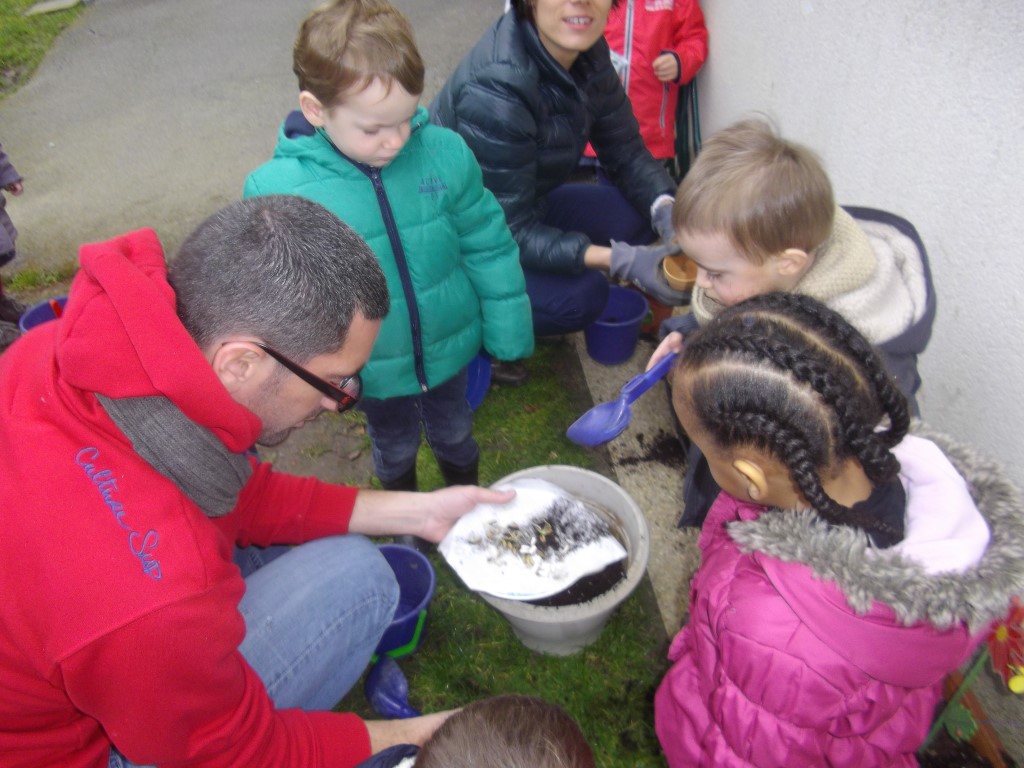 Nous avons semé différentes plantes dans des jardinières ( tournesol, fleur de cotonnier , œillet d’inde , lavande … ) en compagnie de la maman de Paula et du papa d’Hugo qui sont venus nous aider.