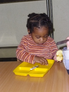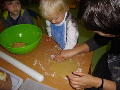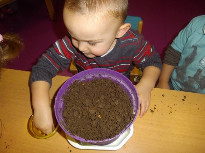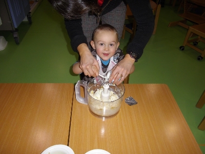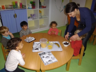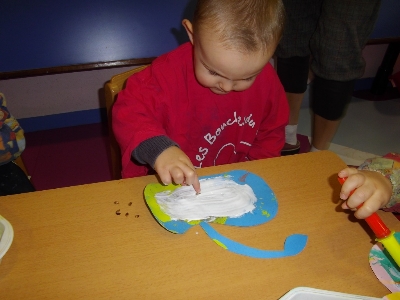 Puis, dans l’après-midi, des enfants ont décoré des pommes avec de la peinture et ils les ont ensuite saupoudrées d’épices (cannelle et muscade). Plus tard dans la semaine, une fois la peinture sèche, les enfants ont collé des pépins sur ces pommes. Mais quand on parle de pommes, on pense bien sûr à des ateliers « patisserie », et c’est également ce que nous avons fait cette semaine! Mardi, les enfants ont préparé un crumble aux pommes et aux poires. Pendant ce temps, des enfants s’attelaient à la préparation d’un pommier. Pour commencer, ils ont utilisé des pommes coupées en 2 en guise de tampons, pour faire des pommes dans le pommier. Puis, une fois la peinture sèche, d’autres enfants ont collé des feuilles de pommiers sur cet arbre. Mercredi matin, ce sont les enfants qui ont préparé la salade de fruits pour le repas du midi. Couper la banane, c’est facile parce que c’est mou, mais couper la pomme, c’est beaucoup plus dur! L’après-midi, c’est également eux qui ont préparé leur goûter! Ce coup-ci, ils ont fait des milks-shake à … la pomme évidemment! Par contre, le robot pour couper la pomme, ça fait du bruit, alors on se bouche les oreilles parfois! Jeudi, la journée a commencé par du coloriage de pommes dans l’espace Nénuphar. Puis, on s’est remis à la cuisine! Au programme: sablés aux épices! Mais aussi : roses des sables! Et … bouligou! Mais qu’est-ce que c’est?? C’est comme une pâte à crêpes avec de la pomme râpée dedans. On en a fait pleins de petites crêpes pour le goûter! Et pour bien finir la journée, un peu de jardinage! Nous avons planté quelques pépins de pommes en espérant bien voir quelque chose pousser… Ce matin, pour finir la semaine, nous vous avons invités à venir prendre le petit déjeuner à la crèche! Vous avez ainsi pu déguster les sablés aux épices et les roses des sables préparés par vos enfants. C’était l’occasion de voir tout ce que les enfants avaient fait cette semaine. Merci d’avoir pris le temps d’échanger avec nous. Pour bien terminer cette semaine basée sur le thème de la pomme, des tartes aux pommes ont été préparées pour le goûter!Miam!! Vous l’avez bien compris, la pomme était à l’honneur, au fil de nos activités, mais également dans nos assiettes! Sandrine, la cuisinière avait prévu, pour nos repas et nos goûters, de la pomme sous toutes ses formes! Des pommes râpées avec les carottes en entrée, des pommes au four, accompagnant des pommes de terre pour le plat, des pommes entières ou de la compote en dessert, du jus de pommes au goûter… Chaque jour, il y avait un peu de pomme dans nos assiettes! Mais, nous avons aussi montré aux enfants la différence entre la pomme crue et la pomme cuite, les différents « éléments » de la pomme (la peau, la chair, le trognon, les pépins), les différentes couleurs de pommes qui existent… Il y avait pleins de choses à découvrir. Nous avions demandé à chaque enfant de ramener une pomme pour qu’on puisse faire toutes ces découvertes. Merci d’avoir participé! Aujourd’hui, c’était la journée « fruits et légumes », l’occasion de ramener quelque chose de la maison. Nous avons ainsi eu de la dinette, des peluches en forme de fruit, des livres, un tablier, un plateau avec des fruits, des gants de jardinier, un bracelet de noisettes… Bravo pour votre imagination! Nous vous remercions d’être toujours aussi impliqués dans la vie de la crèche.