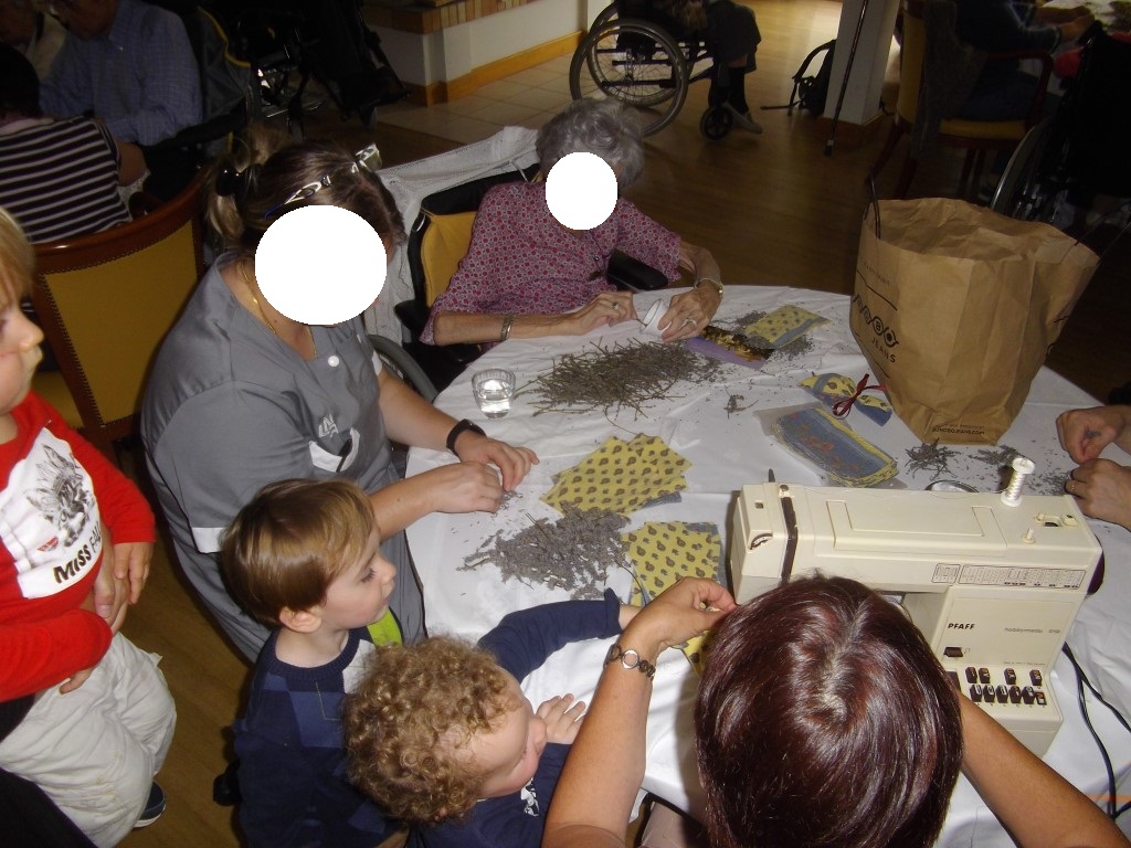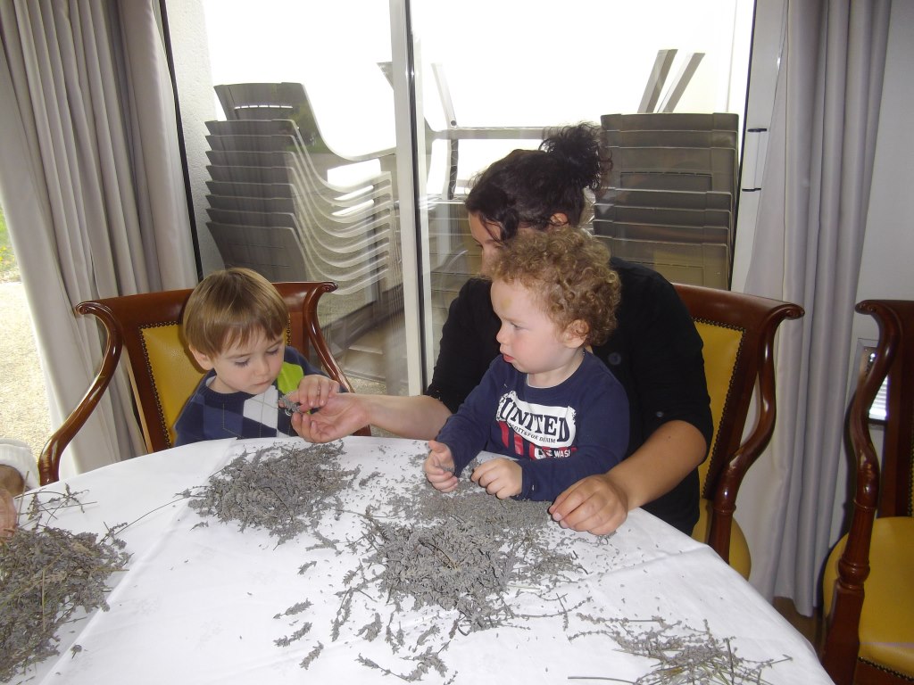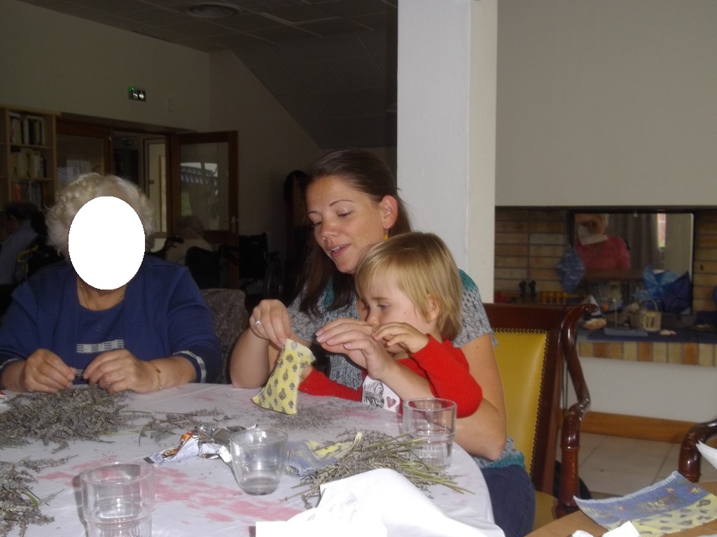 Ylan, Arthur, Marius et Corentin sont partis à la Villa Bleue, accompagnés de Lénaïg et Audrey. Avec les personnes âgés, ils ont égrené de la lavande pour la mettre dans un petit sachet (cousu sous leur yeux) qu’ils ont rapportés chez eux. ils ont poursuivis par un petit goûter tous ensemble.