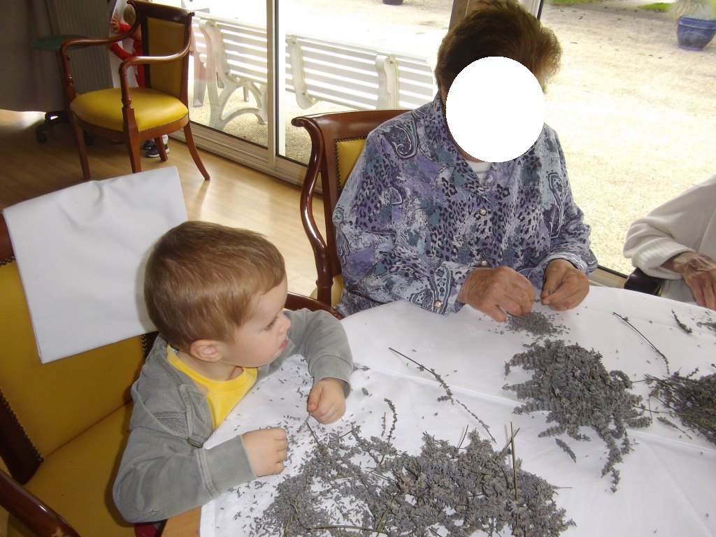 Ylan, Arthur, Marius et Corentin sont partis à la Villa Bleue, accompagnés de Lénaïg et Audrey. Avec les personnes âgés, ils ont égrené de la lavande pour la mettre dans un petit sachet (cousu sous leur yeux) qu’ils ont rapportés chez eux. ils ont poursuivis par un petit goûter tous ensemble.