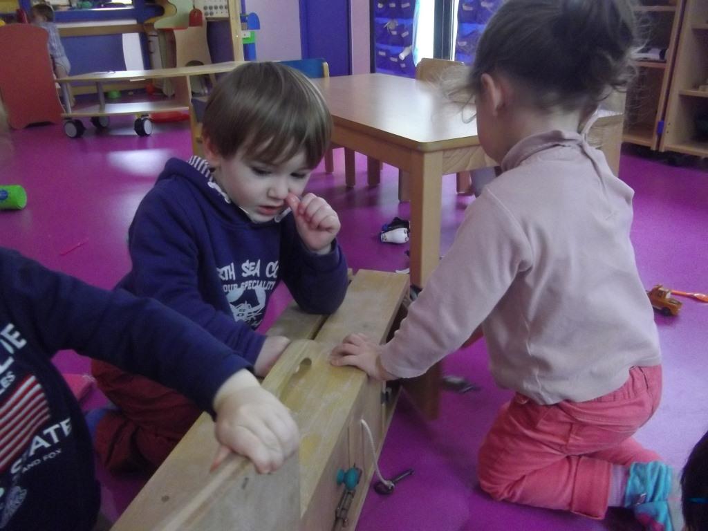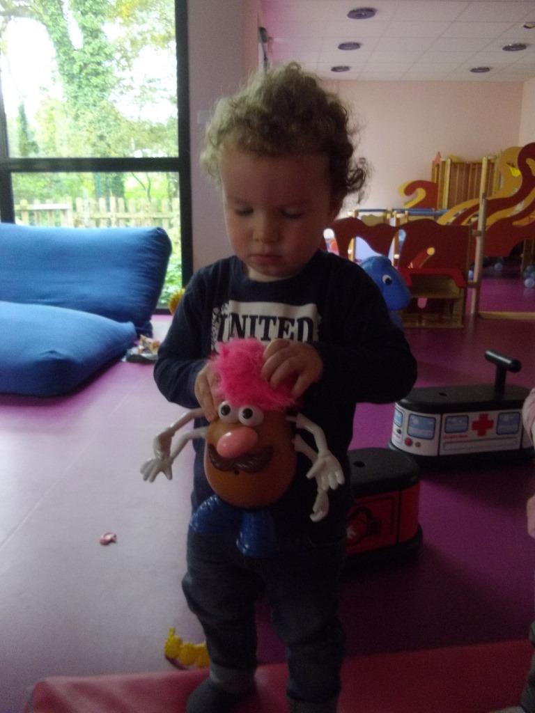Beaucoup de petits jeux sont proposés aux enfants.Il y a les emballages, avec lesquelles ils peuvent sentir les shampoings (mmh, ça sent bon!), ils peuvent manipuler (en appuyant dessus, ils peuvent faire du bruit aussi!), on peut imiter, faire semblant (on se lave les cheveux, le corps ou on lave les cheveux des copains, on boit dans les petits bouteilles, on transvase). Beaucoup d’éveil et d’amusement.La boite à cacher: on y mets des objets à l’intérieur, on ferme et ouvre les petites portes, on passe la main dans le trou pour attraper. Qu’y a-t-il dedans et qu’est ce qu’on peut y mettre? Mr patate, on peut faire des bonhommes étranges!Jeux extérieurs avec des courses mais pas n’importe quelle course, au P’tit Club on fait dans l’originalité, ce sera des courses de draisiennes, de tondeuses et de poussettes.Avec ses supporters bien sûr!!!