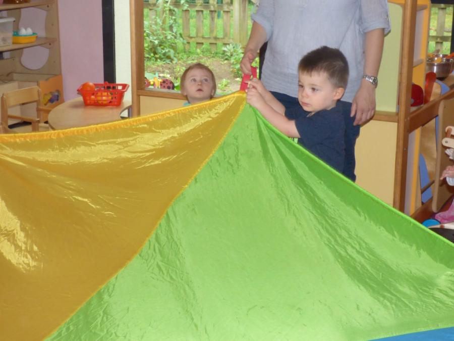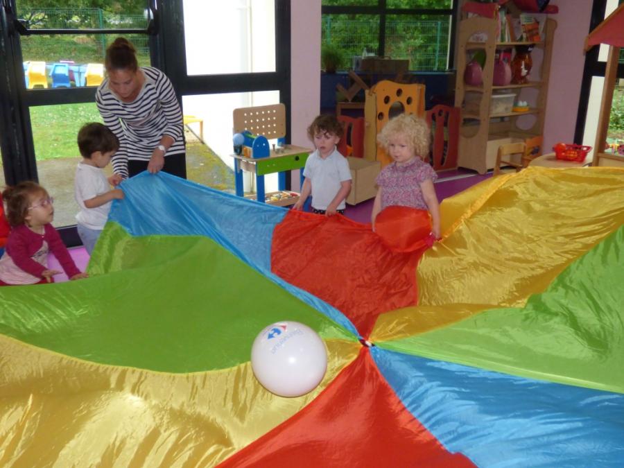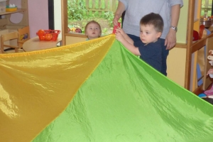 Dans l’espace des plus grands, Grande tour de Kapla, découpage, jeux d’eau, parachute (on fait bouger les balles dans la toile, on s’en sert de hamac, on se cache dessous!!).