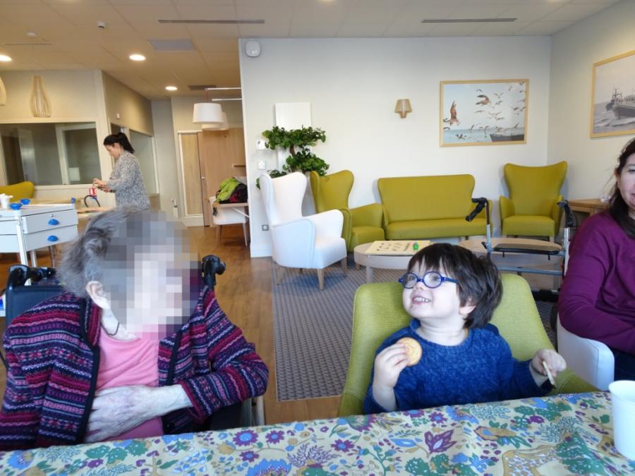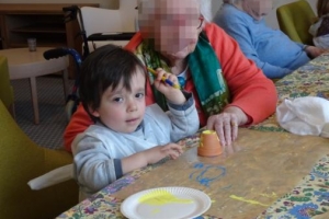 Activité de Pâques. Les enfants ont fait de la peinture sur un pot. Les personnes âgées ont fait du découpage. Un vrai travail d’équipe avec, au finl, la création d’un petit poussin.